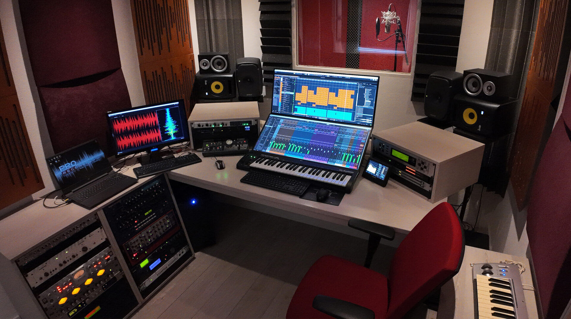 De vocal booth is voorzien van akoestische panelen voor een mooi droog geluid en heeft een comfortabele temperatuur door de aanwezige airco.